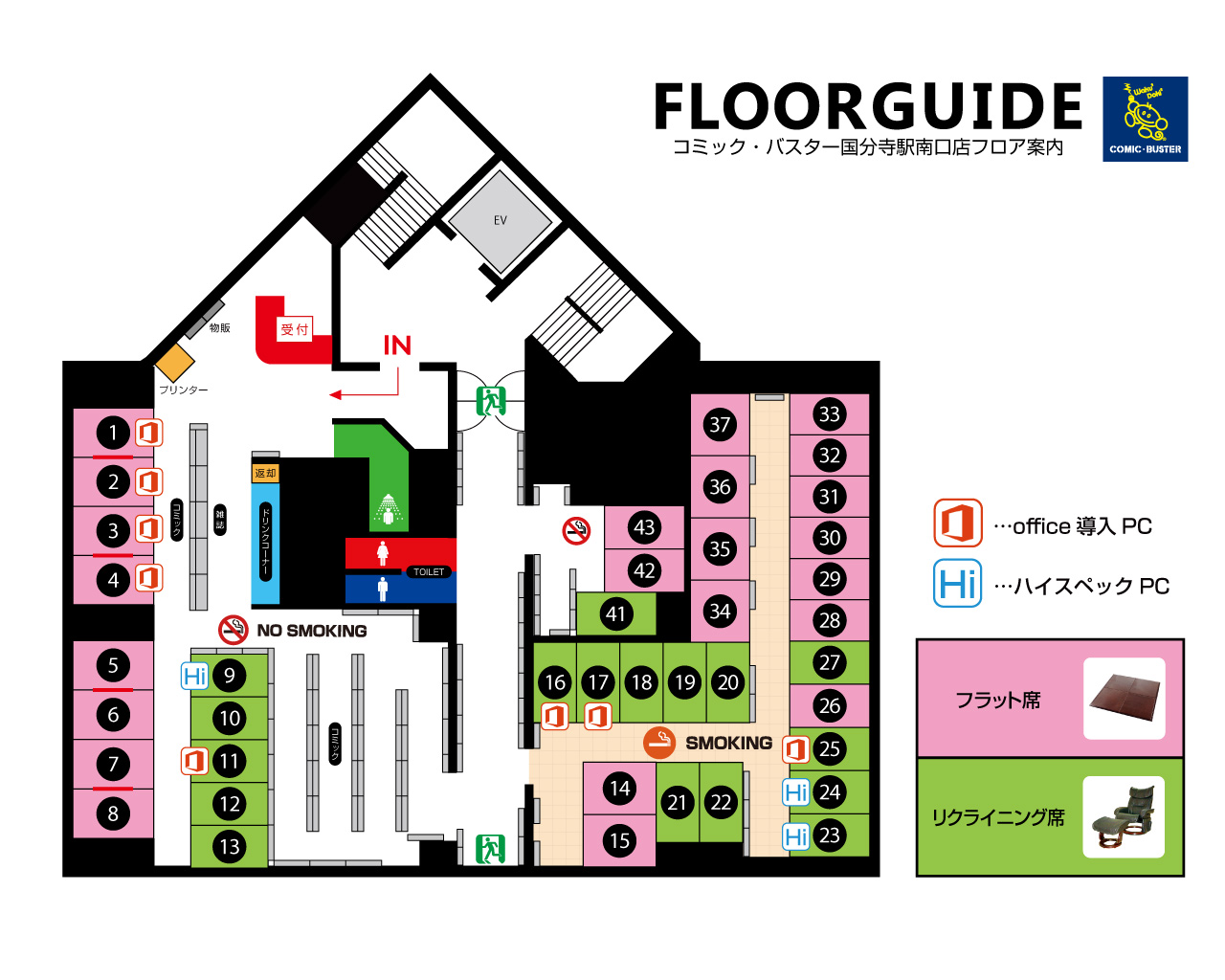 シャワー室完備・印刷機完備・完全分煙・飲食物持ち込みOK・途中外出可能・ブースは全席鍵付きなので女性の方も安心しておくつろぎいただけます。
