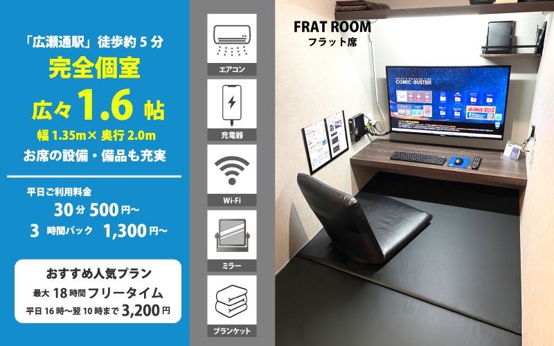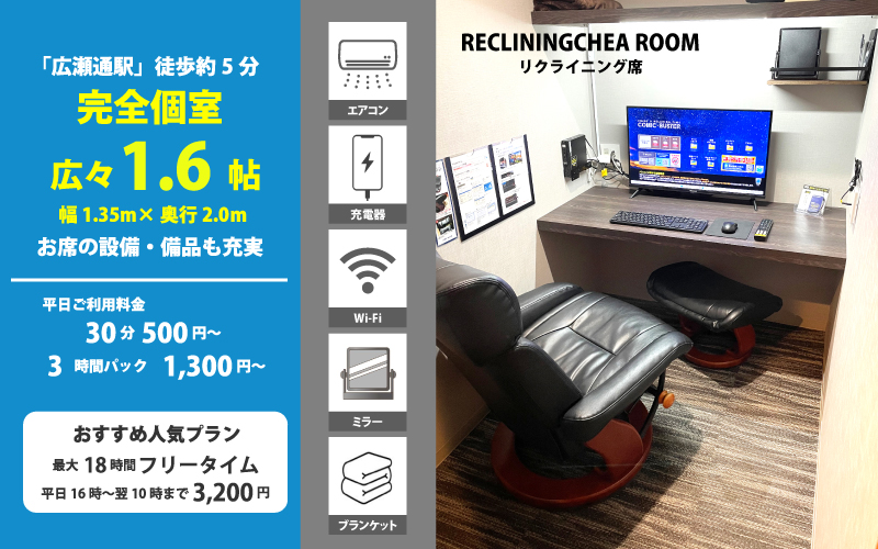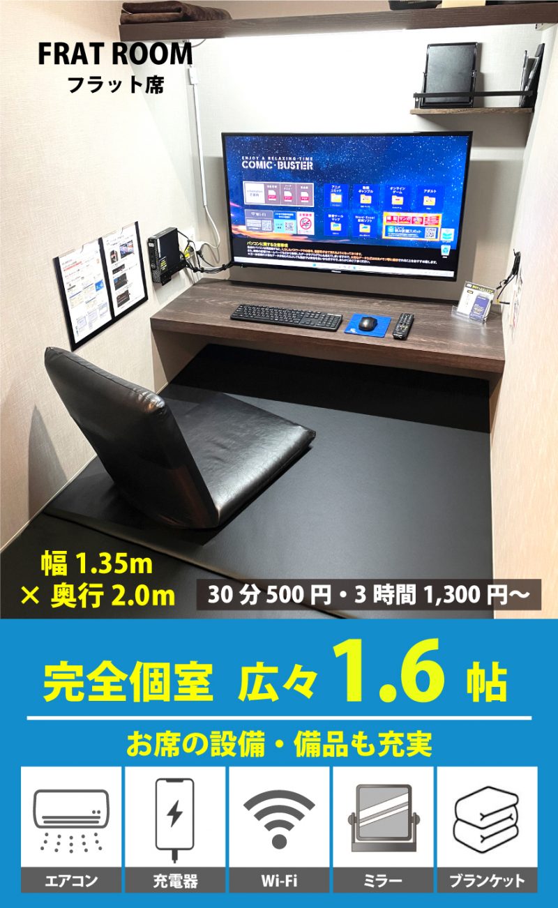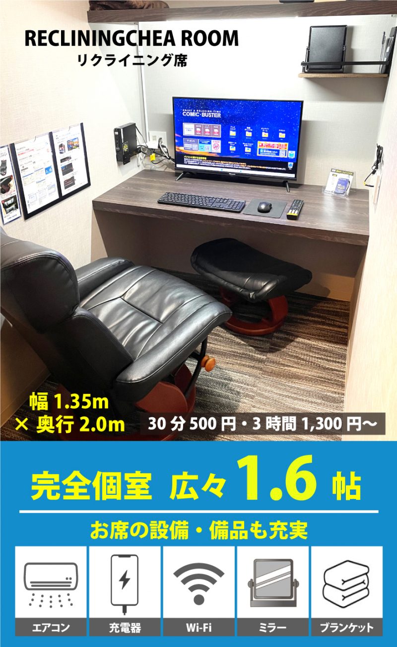 コミック・バスターでは店内環境の維持・改善に日々努めておりますが、完全個室は更に安心してご利用いただける空間となっております。仕事に勉強に休憩に、お一人の時間を安心してお過ごしください。