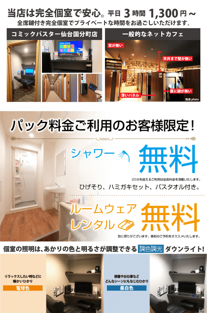 仙台の繁華街「国分町」「一番町」近くのインターネットカフェ&漫画喫茶です。仙台駅周辺からもアクセス良好! 女性も安心・安全なカギ付き完全個室で防音、シャワー完備・完全禁煙・喫煙ルーム設置・コインランドリー有、とネカフェ最先端の設備内容・サービスをご提供しております。カードキーでセキュリティもバッチリ!